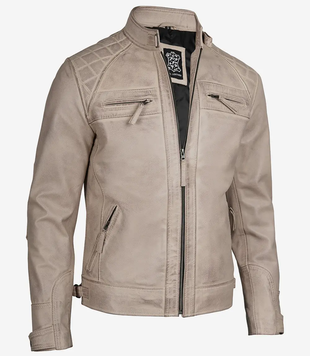 Warm Beige Leather Cafe Racer Jacket – Mens Quilted Style