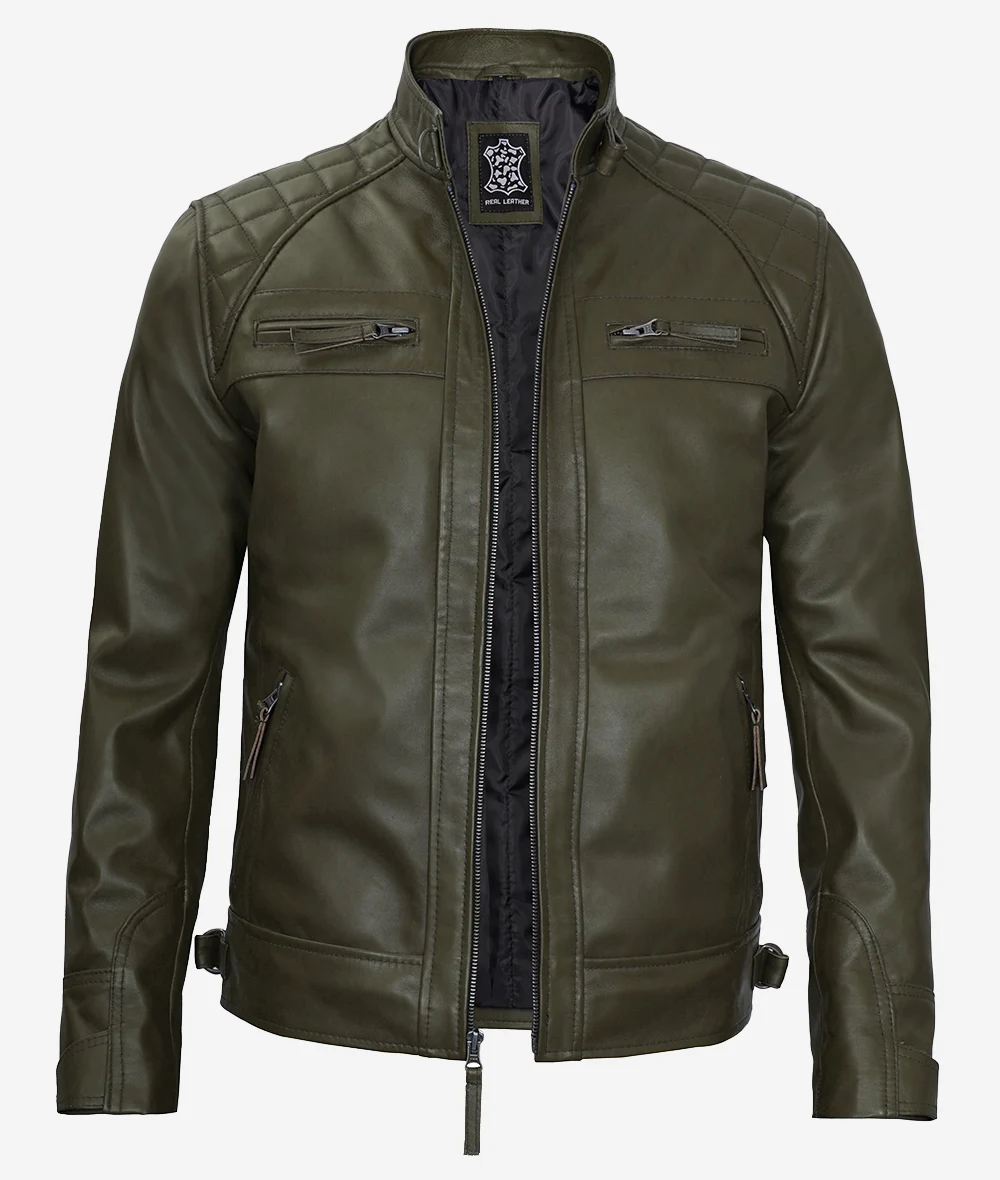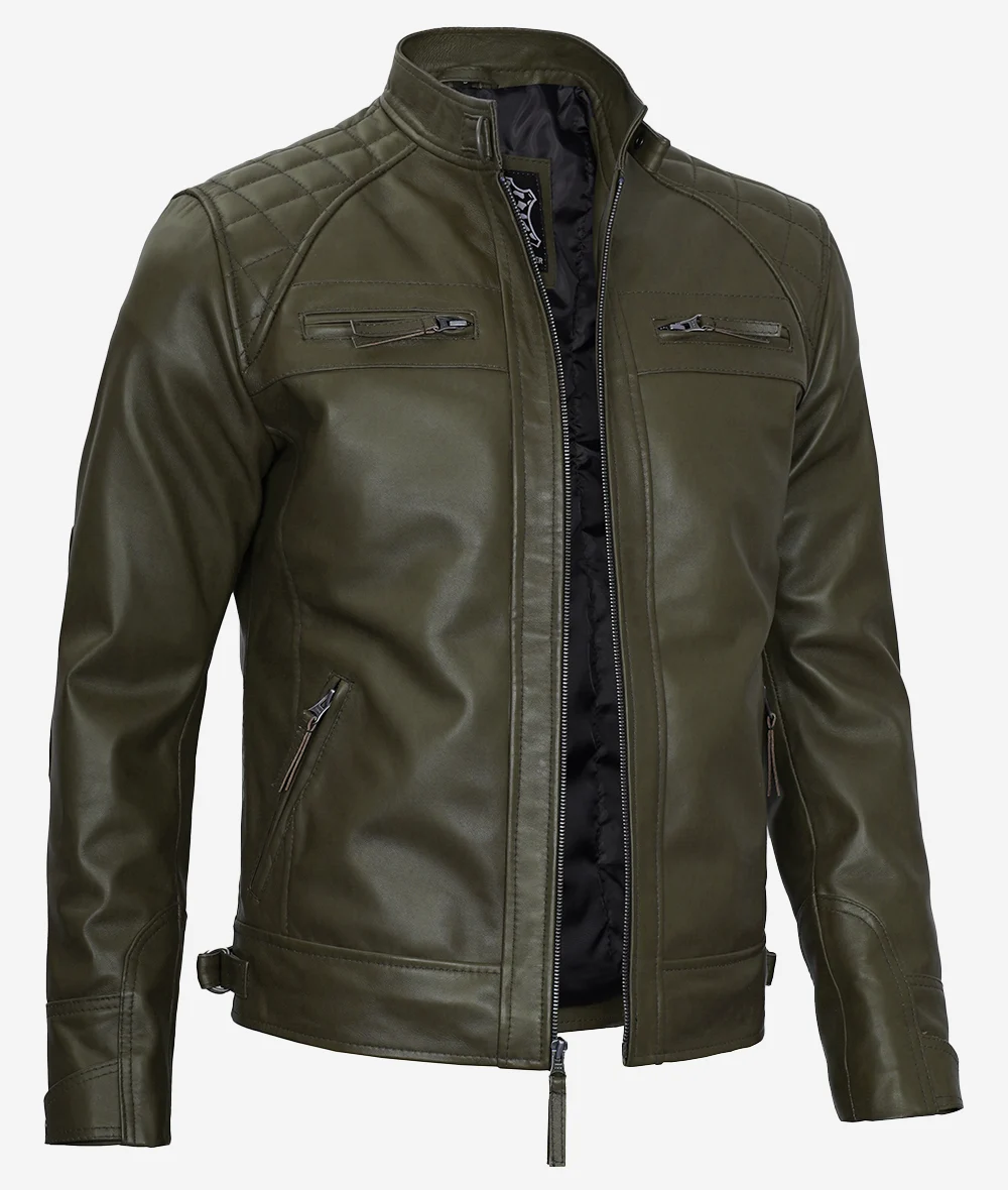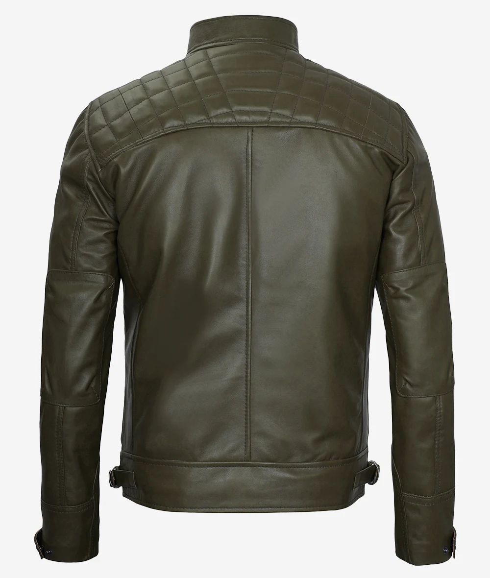 Premium Olive Green Cafe Racer Leather Jacket Men Quilted Edition
