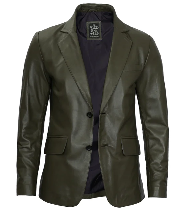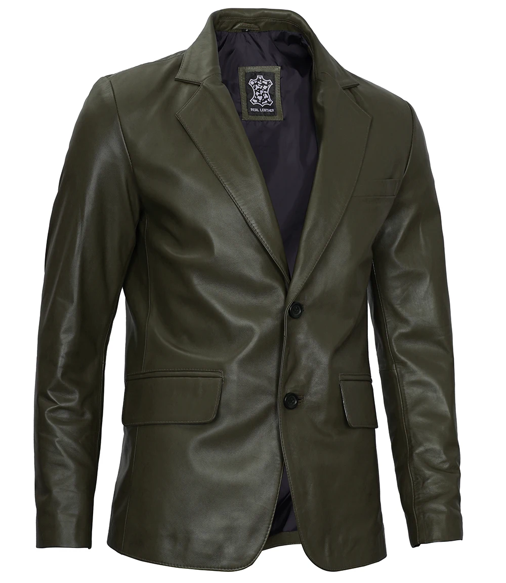 Mens Two Button Olive Green Leather Blazer