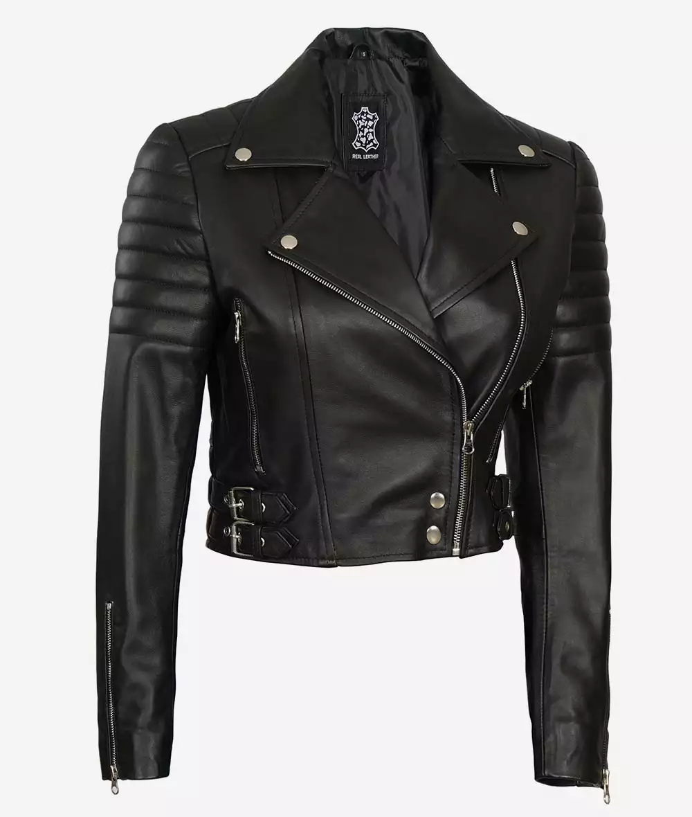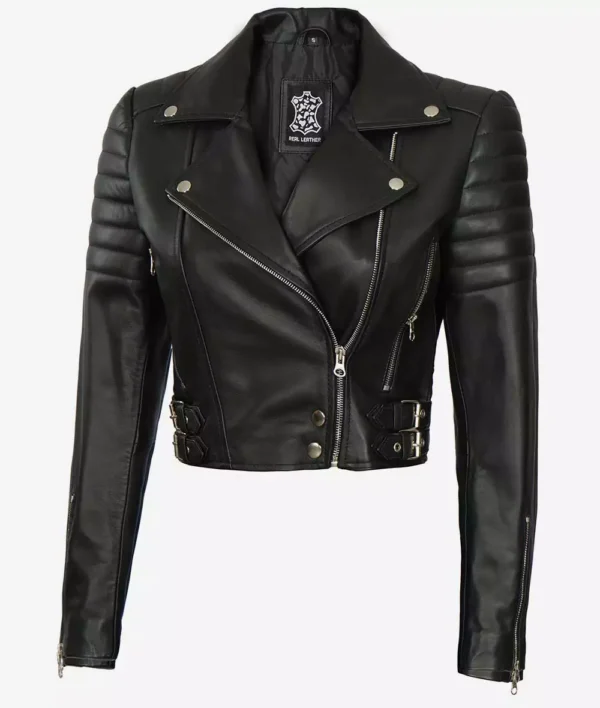 Women Black Cropped Moto Leather Jacket