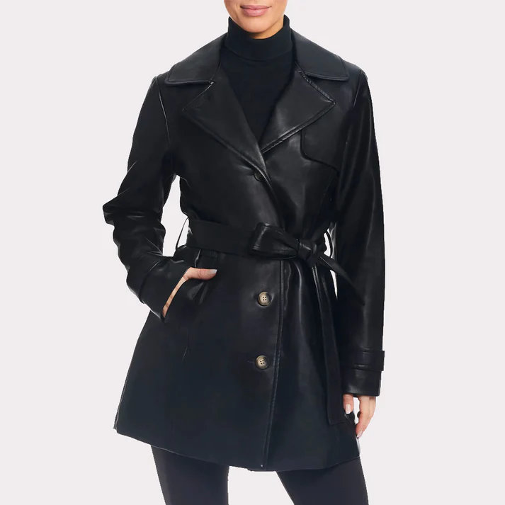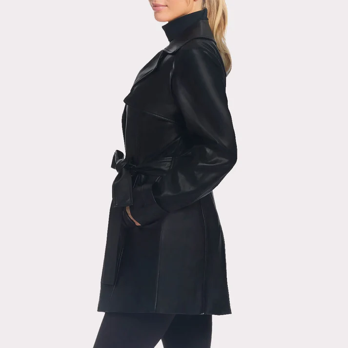 Women Solid Black Leather Trench Coat